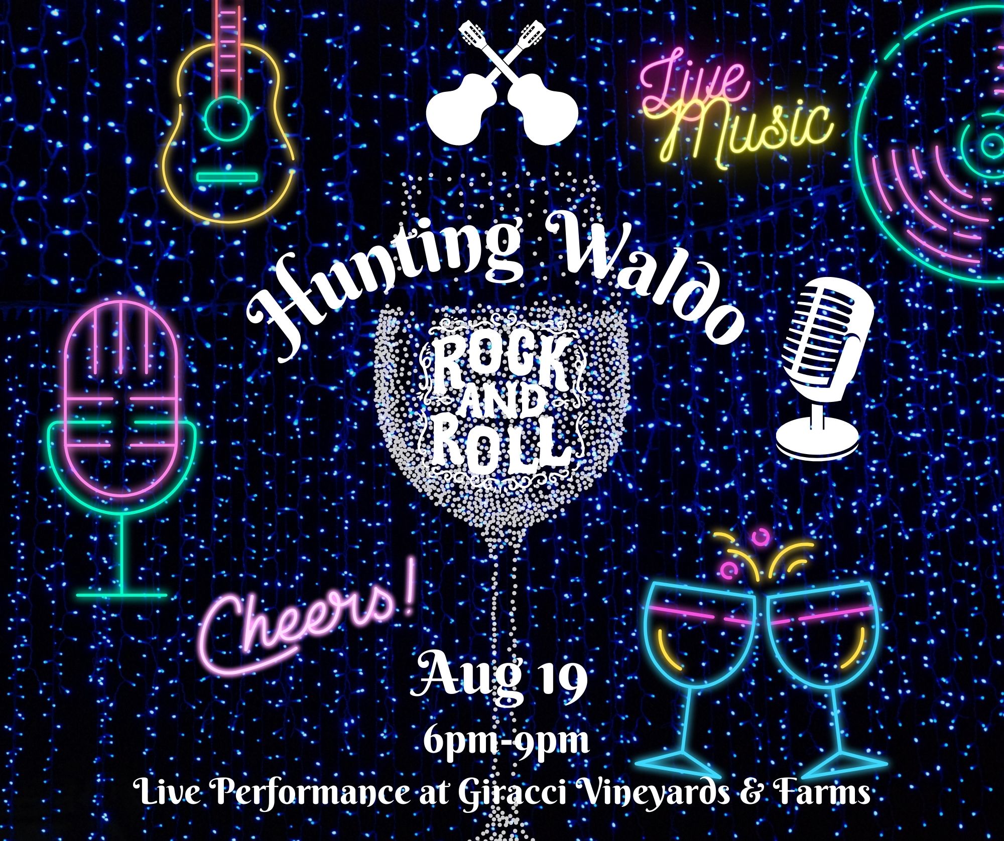 Live Perforamce by Hunting Waldo! Event starts from 6-9pm on June 17th. Meal tickets are available for purchase now. Ticket holders will receive one dinner plate. Dinner includes teriyaki chicken, rice & macoroni salad. No entry fee. Two-drink minimum per person. Wine not included. For any questions, please email wineclub@giracci.com